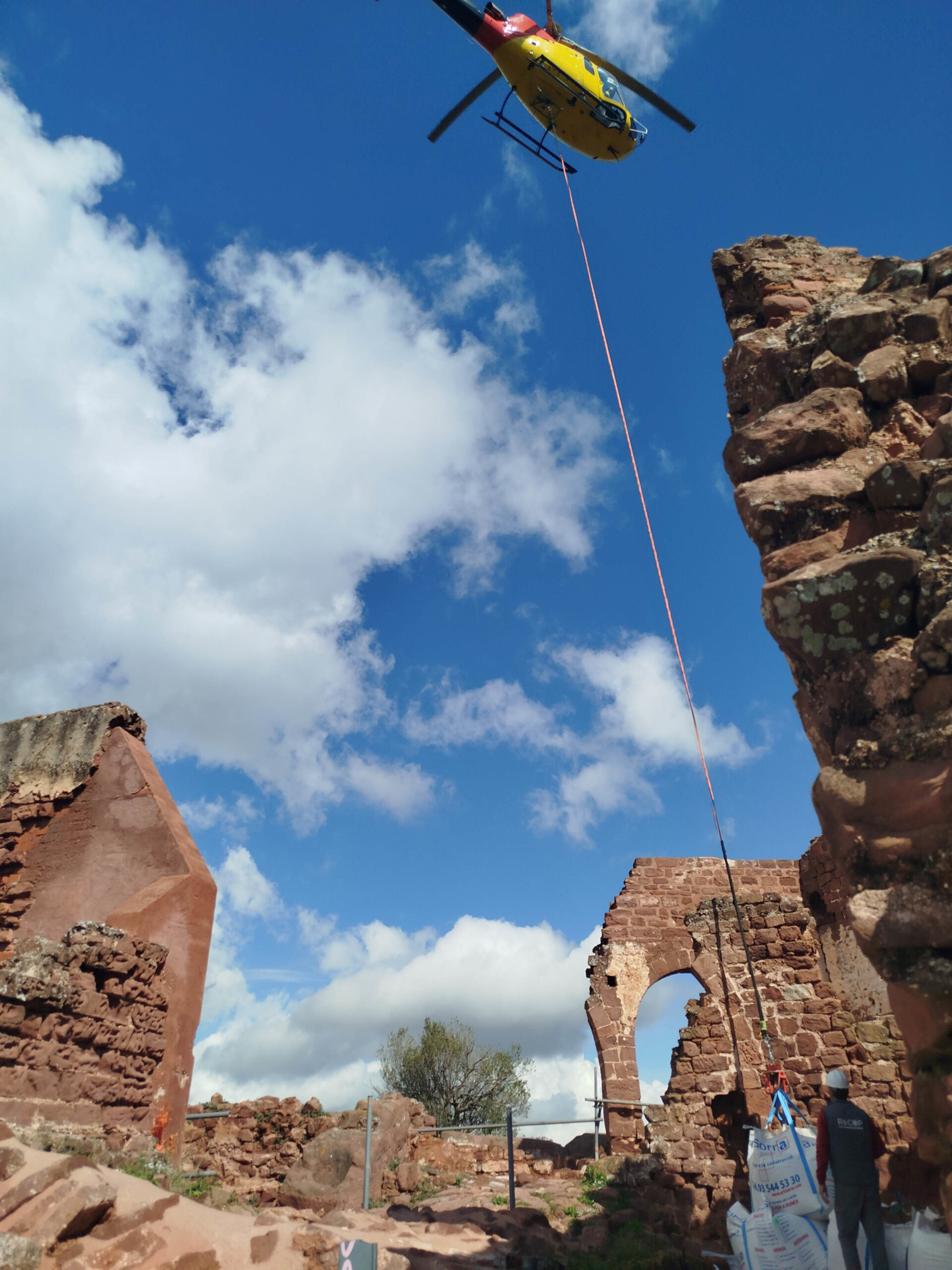 ACN Gavà – L’Ajuntament de Gavà ha posat en marxa les obres per consolidar el castell d’Eramprunyà, datat del segle IX. Aquest dilluns, i davant la dificultat d’accedir-hi amb camions, un helicòpter va pujar fins al recinte del castell tot el material necessari per dur a terme l’actuació. Les obres, amb un cost de gairebé 3 milions d’euros provinents dels fons europeus Next Generation, consistiran en la consolidació del mur que forma part del baluard, l’adequació del recinte per ser visitat i la restauració de l’edifici, incidint en els elements defensius corresponents als segles XIV i XV. També es millorarà l’accessibilitat del camí medieval que surt des de l’ermita de Bruguers i arriba fins al castell.