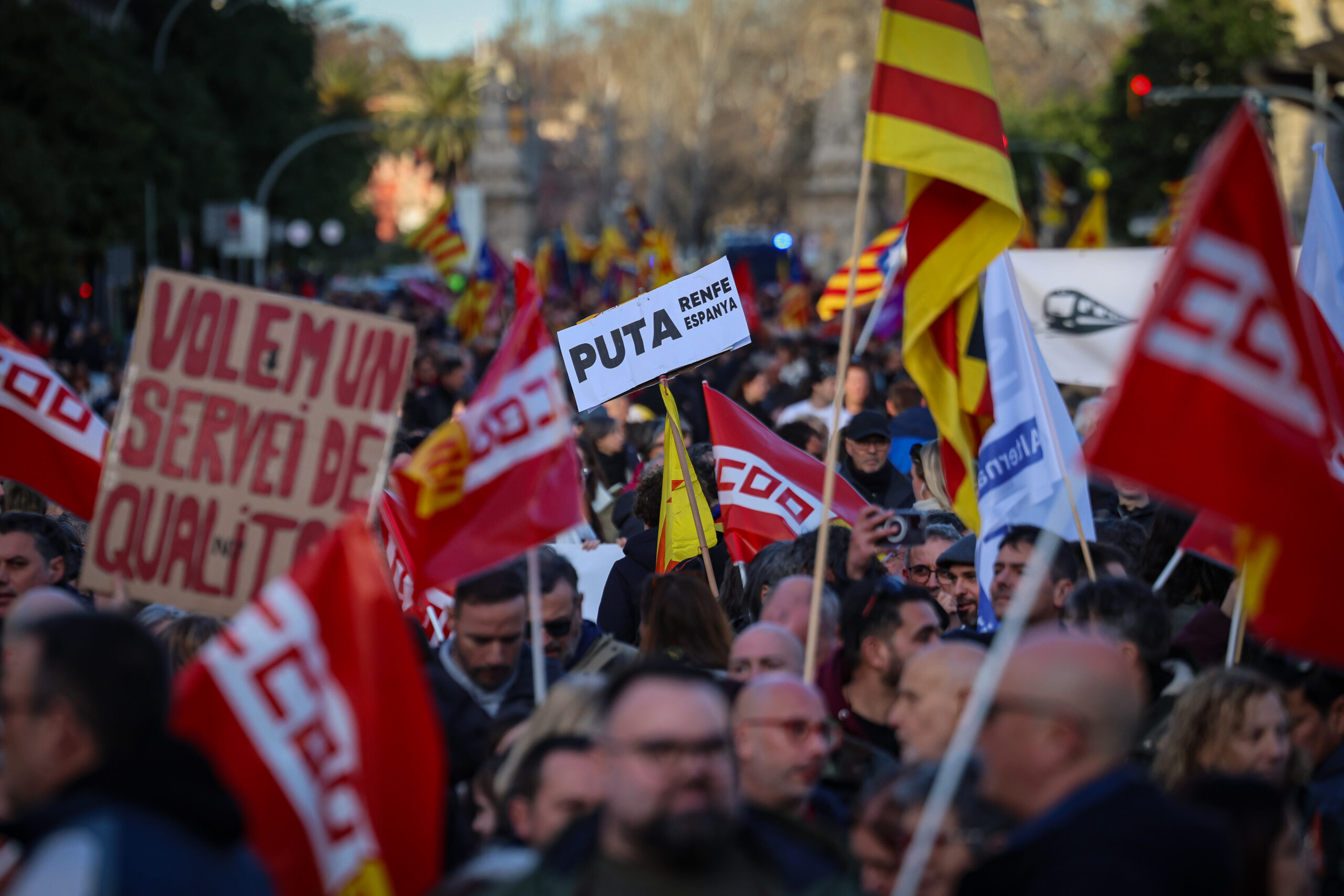 ACN Barcelona – Milers de persones han participat aquest dissabte a la tarda a la manifestació convocada per una vintena d’entitats per denunciar la situació de Rodalies. La marxa, amb lema ‘Sense trens no hi ha futur’, ha començat a les cinc de la tarda a l’estació de França de Barcelona i ha acabat a les sis a la plaça Sant Jaume. Els convocants han denunciat retards, manca de seguretat, desinversió i una mala gestió d’Adif, Renfe i els governs de l’Estat i Catalunya. Segons la Guàrdia Urbana, la participació a la manifestació ha estat de 3.000 persones, mentre que els organitzadors eleven la xifra a 40.000. La marxa arriba hores després de la que han convocat l’ANC i el Consell de la República, que ha aplegat un gruix més important de manifestants.