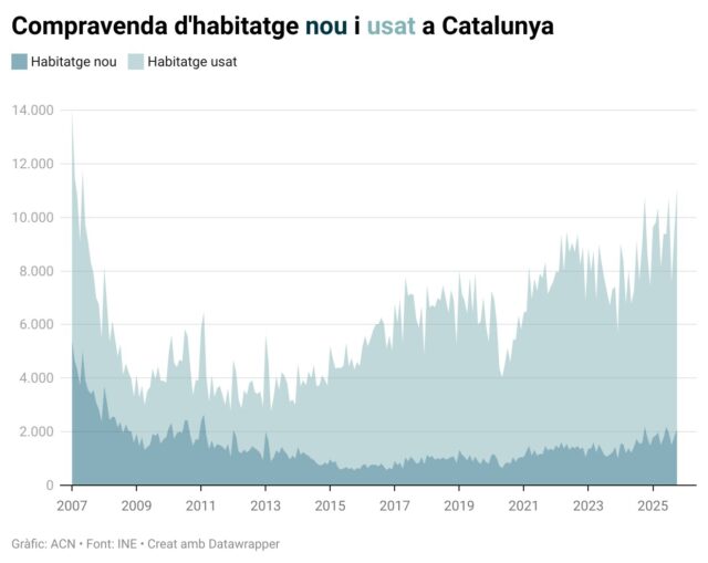El rècord mensual d’adquisicions d’immobles és el tercer que es registra enguany, després de les 9.481 operacions del setembre (+6%) i de les 10.729 transaccions del juliol (+17,6%). El 2025 concentra tres màximes mensuals, per darrere del 2007 que en suma sis.