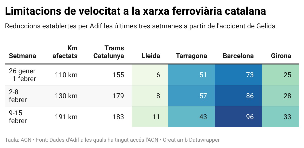 Les limitacions de velocitat a la xarxa ferroviària afectaran 191 quilòmetres la setmana que ve, 61 més que aquesta
