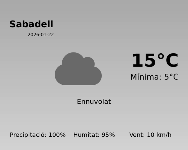 Avui, 22 de gener de 2026, Sabadell es prepara per a un dia amb condicions meteorològiques variables. Els termòmetres registraran una temperatura màxima de 15°C, mentre que la temperatura mínima es preveu que assoli els 5°C.